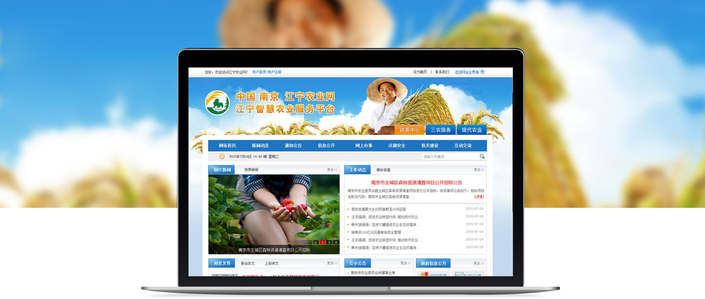 南京市江区宁农业局分别展示政务中心、三农服务、现代农业三个站点,每个站点都从不同的方便公布了政务公开,网上办公等事务;